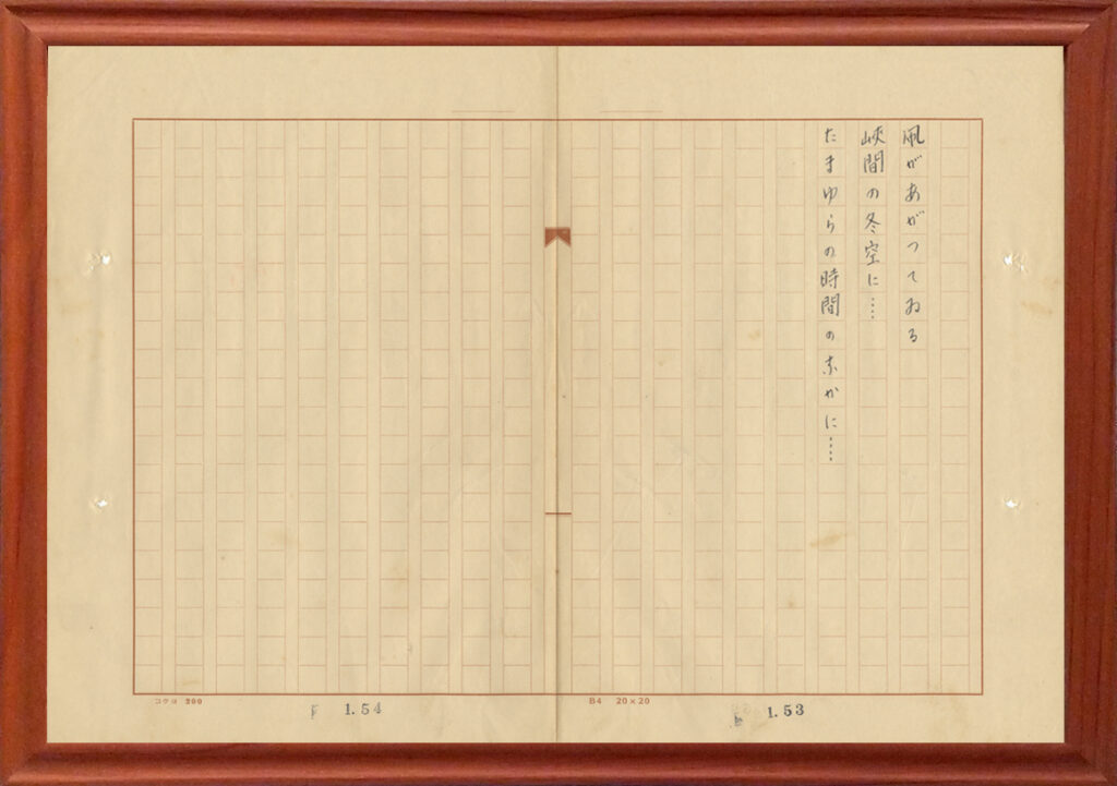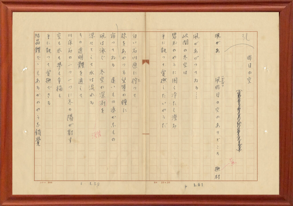 第2展示室では、髙森文夫が第2詩集としてまとめながら世に出なかった未刊直筆原稿集「嬌羞(きょうしゅう)の歌」に収録されている詩51篇を1ヶ月ごとに順次展示しています。 11月は「昨日の空」(きのうのそら)です。 この作品は、昭和27年1月19日付、日向日日新聞(現宮崎日日新聞)に掲載されました。また、昭和43年に出版された第2詩集の表題作でもあります。