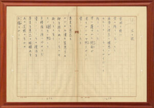 第2展示室では、髙森文夫が第2詩集としてまとめながら世に出なかった未刊直筆原稿集「嬌羞(きょうしゅう)の歌」に収録されている詩51篇を1ヶ月ごとに順次展示してきました。 3月は「石の歌」(原稿用紙1枚)です。 令和5年6月から始めた未刊直筆原稿集の公開も、今月が最後となりました。