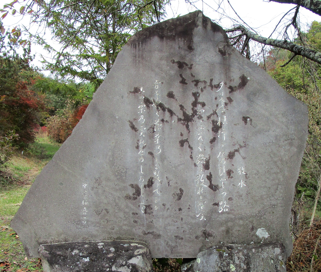 夕日左す枯野可゙原乃ひ登つ路わ可゙以そぐ路爾散禮る栗実 (夕日さす枯野が原のひとつ路わがいそぐ路に散れる栗実) 音やぐ落葉乃下爾散りてをる古の栗乃実能色のよろし左 牧水 (音さやぐ落葉の下に散りてをるこの栗の実の色のよろしさ)