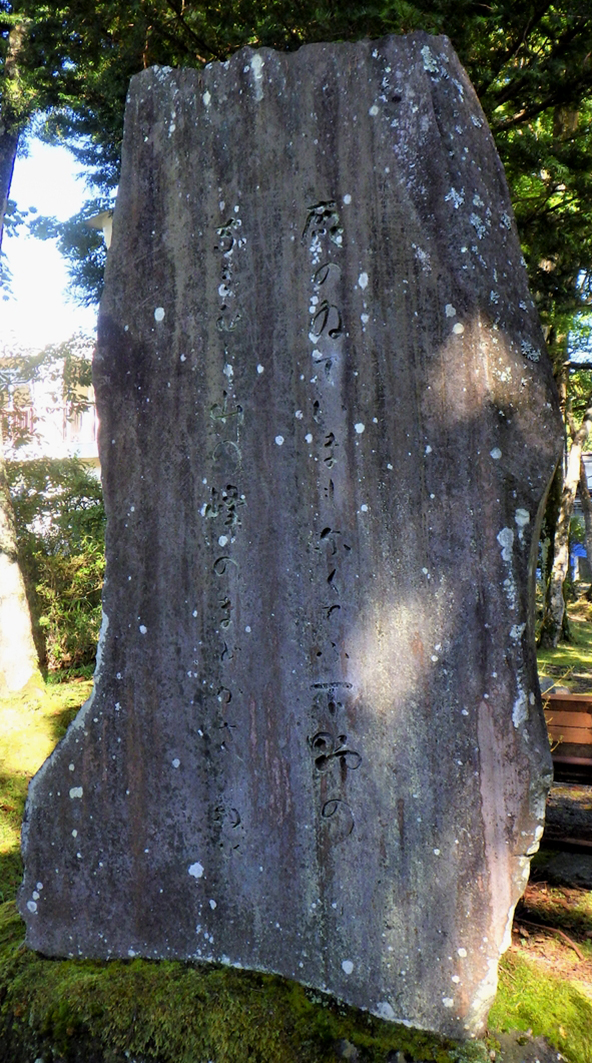 後に同地で新聞店を営む星野利一がその歌の書を手に入れ、鳴虫山を真向かいに仰ぐ花石神社境内に歌碑を建立した。